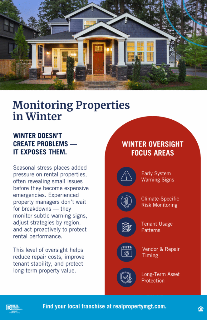 In colder regions, properties face freeze-related plumbing stress and increased heating demands. In milder or coastal areas, moisture intrusion and drainage challenges are more common. Even in warmer climates, winter can expose insulation gaps, strain HVAC systems, and bring unpredictable weather events.